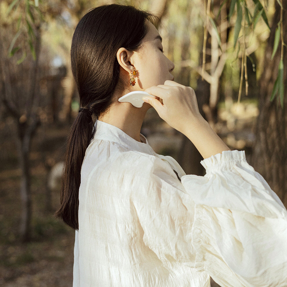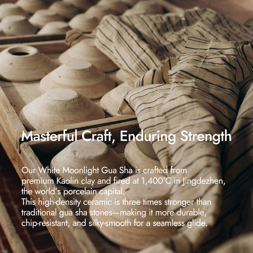 our White Moonlight Gua Sha. Fired at 1,400°C in Jingdezhen—the world’s porcelain capital—this fine clay transforms into a high-density ceramic, making it three times stronger than traditional gua sha stones.