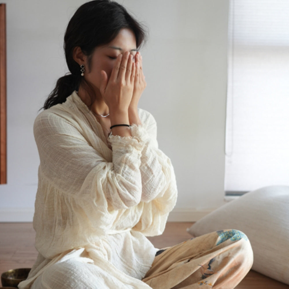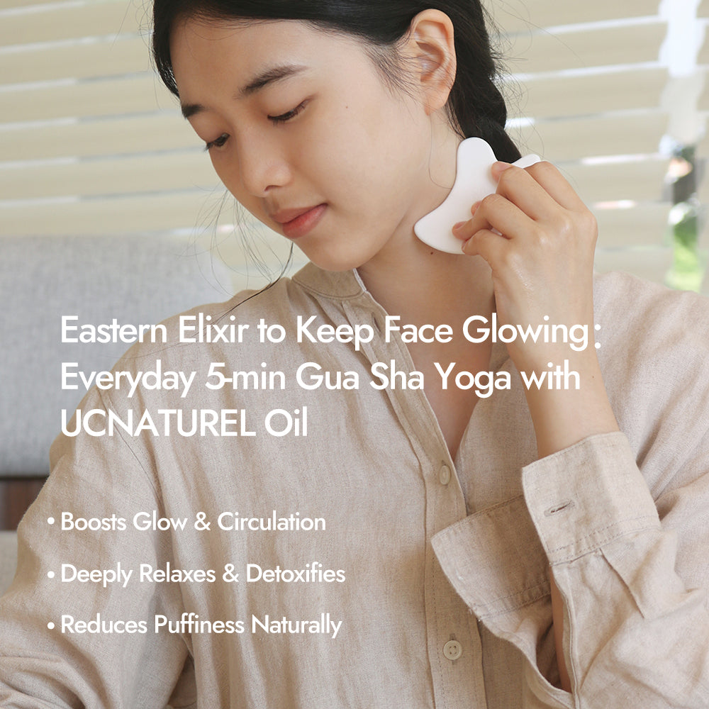Face Gua Sha Yoga: Using UCNATUREL face oil with the customized procelain gua sha tool every 5-minute a day to energize the skin.